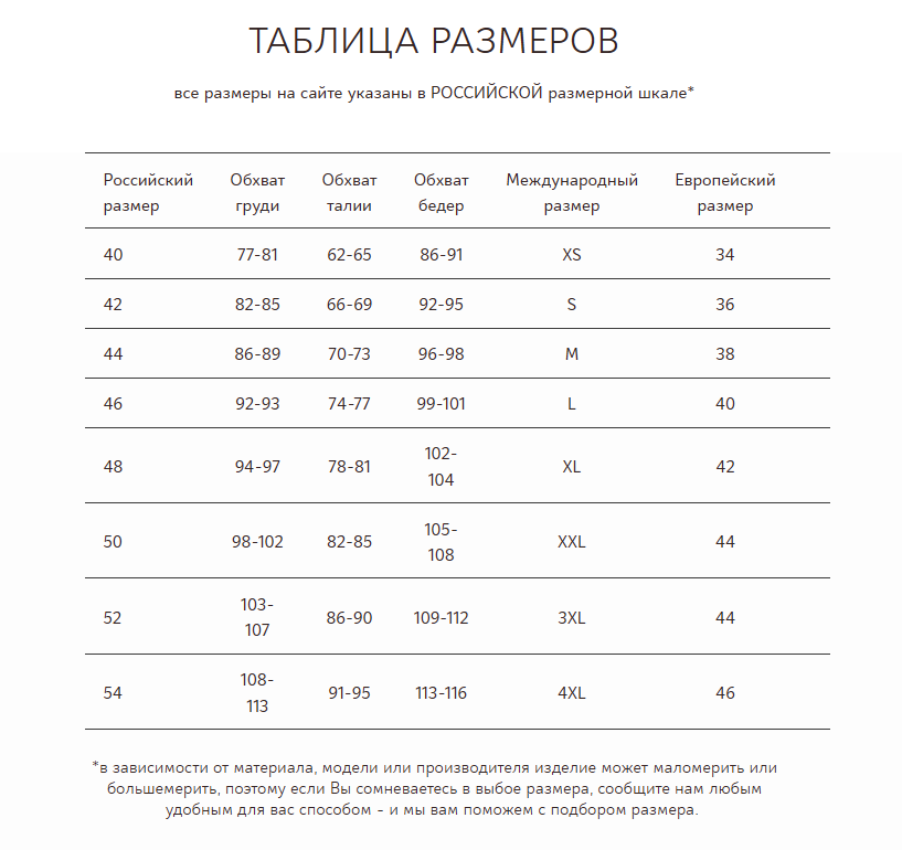 Все размеры, представленные на сайте, указаны по российской размерной сетке.